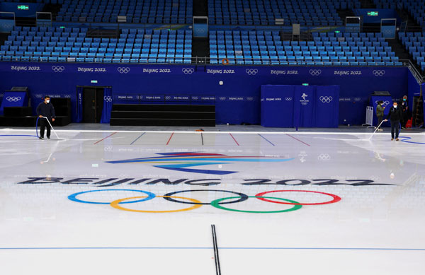 2022年北京冬季五輪のスケート会場に氷を張るスタッフたち(C)ロイター