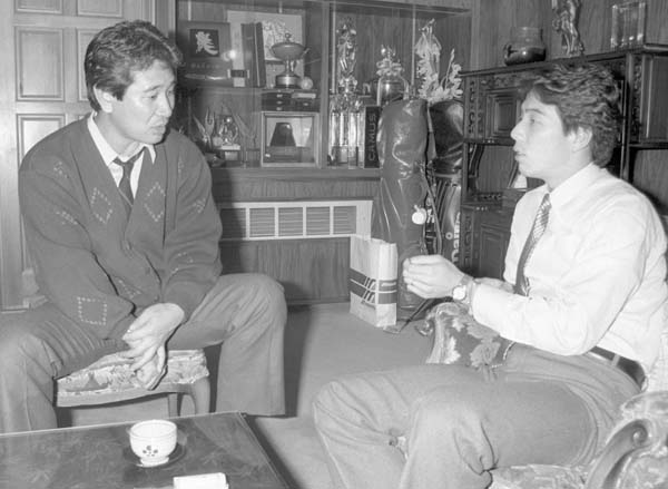 牛島(右)を自宅に呼び、トレードについて話し合う星野監督(1986年)/(C)共同通信社