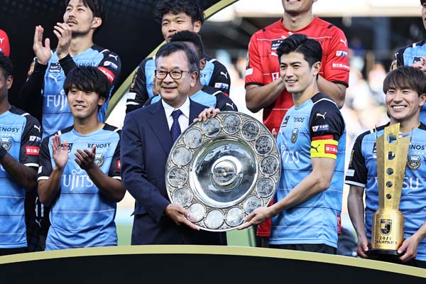 2021年J1優勝のプレートを手にする谷口(右)/(C)Norio ROKUKAWA/office La Strada