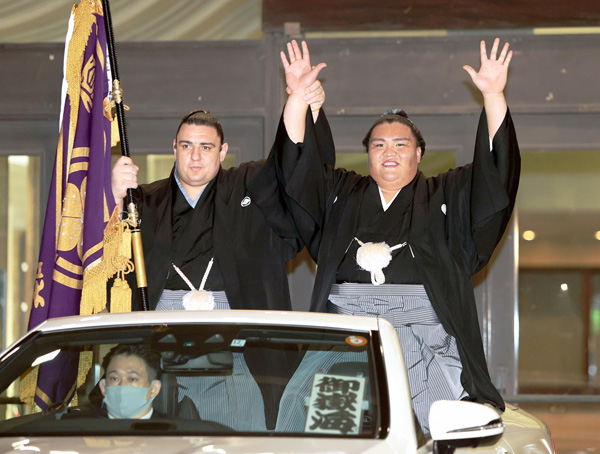 優勝して笑顔を見せる御嶽海(右)/(代表撮影)