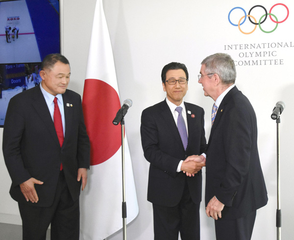 会談後、バッハIOC会長(右)と握手を交わす秋元克広・札幌市長。左は山下泰裕JOC会長(C)共同通信社