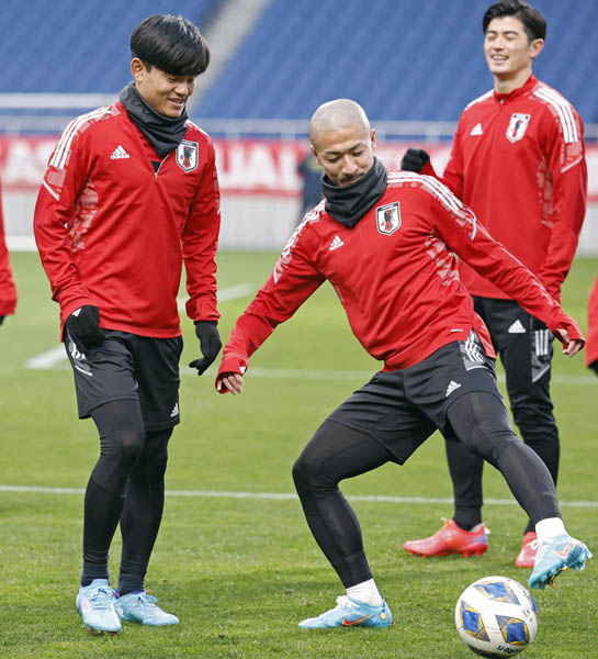 前日調整する前田(右)と久保(C)共同通信社