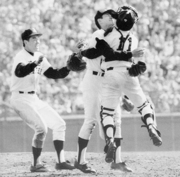 V決定の瞬間、捕手・松下と抱き合う橋本氏(C)共同通信社