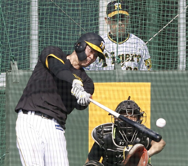佐藤輝のフリー打撃を見守る矢野監督(C)共同通信社