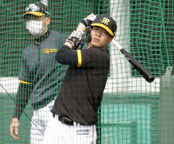 打撃練習する佐藤輝(左は矢野監督)/(C)共同通信社