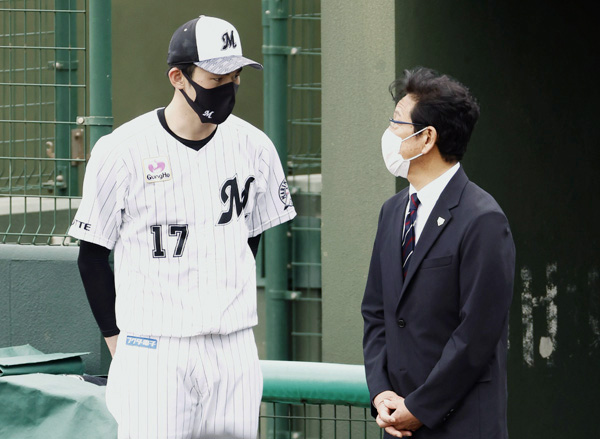 キャンプの視察に訪れた日本代表の栗山監督(右)と話す佐々木朗(C)共同通信社