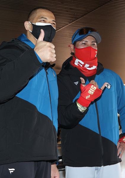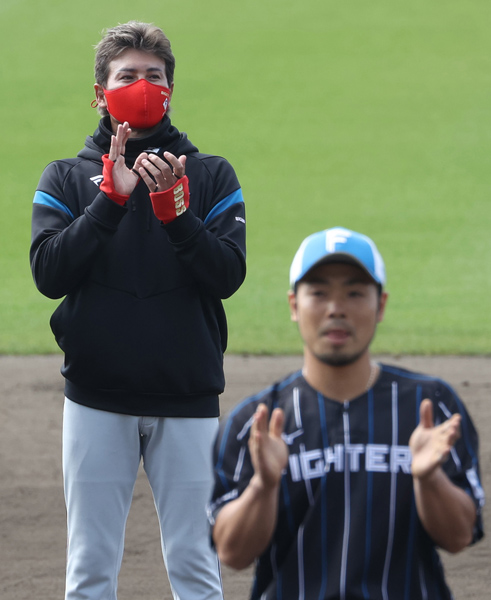 キャンプ打ち上げの手締めを行う選手会長の近藤(手前)と新庄監督(C)日刊ゲンダイ