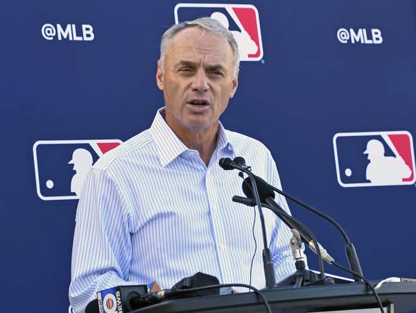 労使交渉が決裂し、記者会見するMLBのマンフレッド・コミッショナー(C)共同通信社