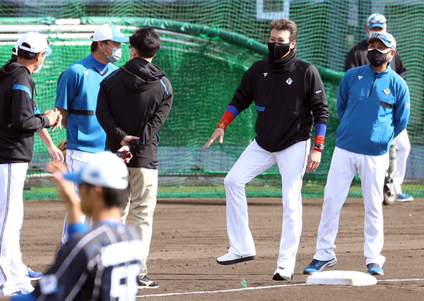 コーチ陣と話す新庄監督(C)日刊ゲンダイ
