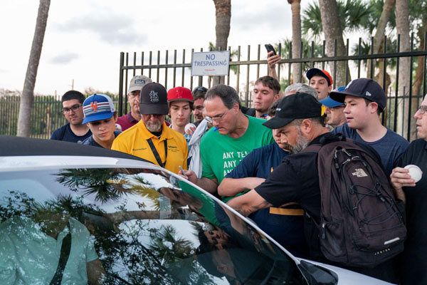労使交渉に出席していたヤンキースのゲリット・コール投手(車内)に集まるファン(C)ロイター/USA TODAY NETWORK
