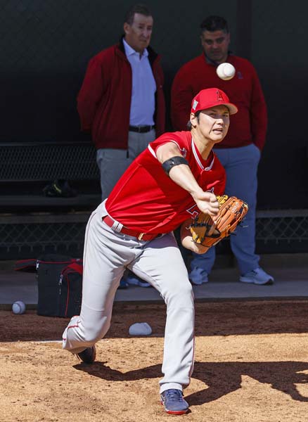 ブルペンに入った大谷、17日は実戦形式の打撃練習に登板予定(C)共同通信社
