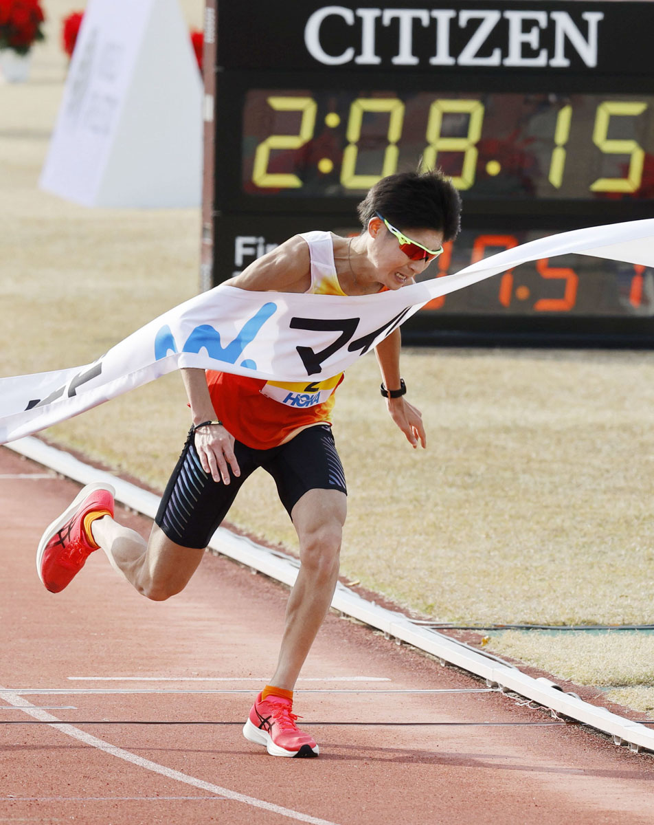 2021年12月の福岡国際マラソンで、日本勢最高の2位でゴールする細谷恭平(C)共同通信社