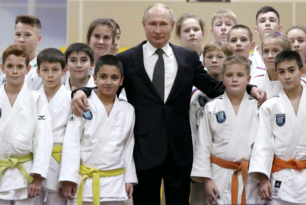 少年時代に稽古した柔道場で子どもたちと記念撮影に応じるプーチン大統領は有段者として知られているが…(C)タス=共同