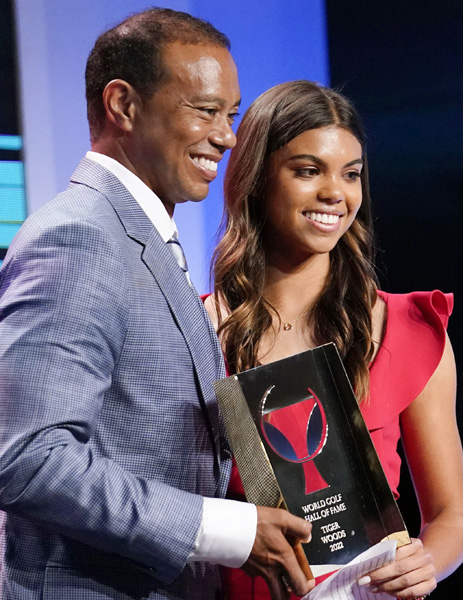 ゴルフ場の外で大忙し。ゴルフ殿堂入り記念式典に娘のサムさんと(C)AP=共同