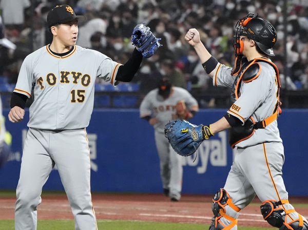 圧巻の火消し役(小林とグータッチする大勢=左)/(C)共同通信社