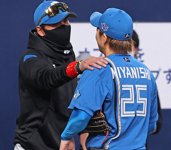 2点勝ち越し打を許し、ベンチに戻る宮西に声をかける新庄監督(左)/(C)日刊ゲンダイ