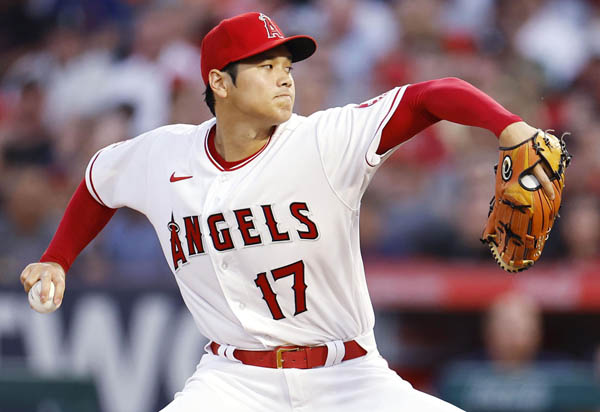 8日、開幕戦に先発投手と「1番・DH」で出場、投球する大谷。アストロズのアルトゥールはバットを振れず(C)共同通信社