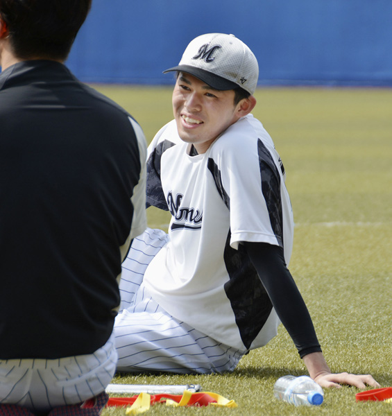11日、完全試合達成から一夜明け、練習で笑顔を見せるロッテの佐々木(C)共同通信社