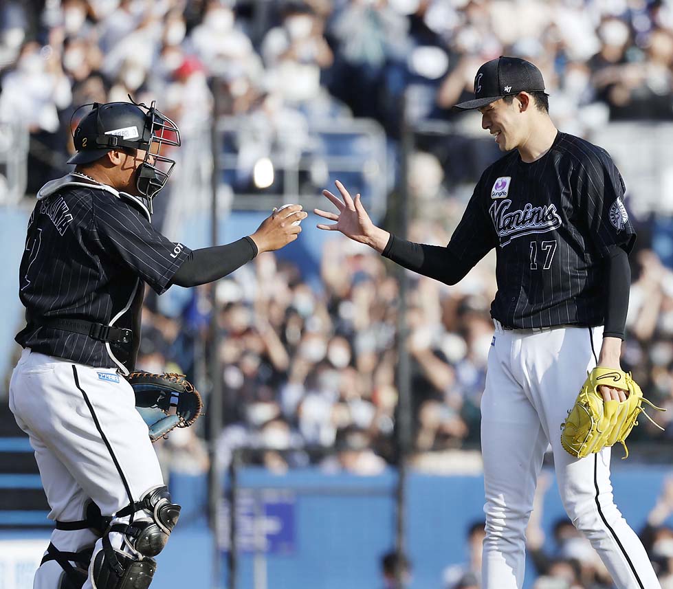 完全試合達成時の佐々木(捕手・松川と)/(C)共同通信社