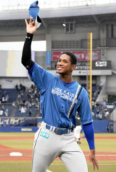 決勝本塁打を放って試合後、歓声に応える万波(C)共同通信社