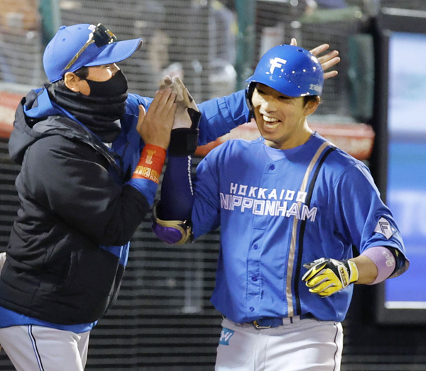 前日19日には先制2ランを放った宇佐見(左は新庄監督)/(C)共同通信社