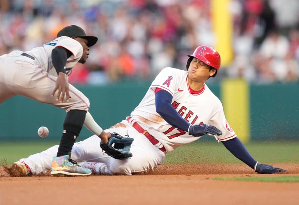 12日のマーリンズ戦で今季初盗塁を決めた大谷(C)ロイター/USA TODAY Sports