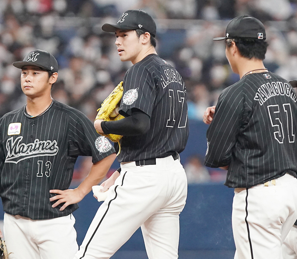 イニングの合間に注意すればいいものを…(ロッテ佐々木朗希投手=央)/(C)日刊ゲンダイ