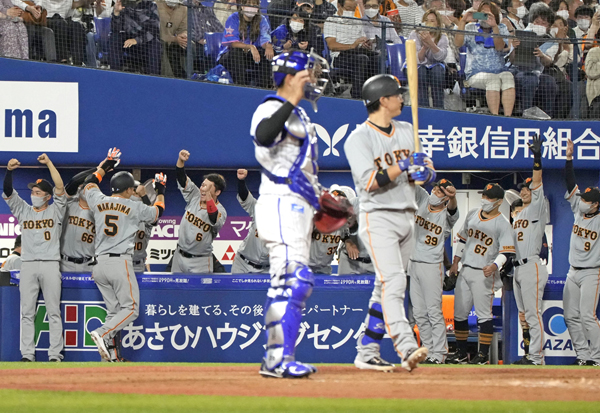 首位快走だけど…(四回に満塁本塁打を放った中島〈5〉を迎える巨人ナイン)/(C)共同通信社