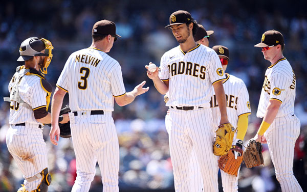 七回途中に降板するダルビッシュ(C)ロイター/USA TODAY Sports