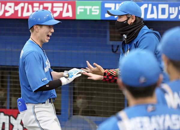 先制弾を放った松本剛を出迎える新庄監督(右)/(C)共同通信社