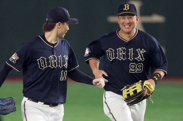 先発勝利の山崎(左)と笑顔でベンチに引き上げる杉本(C)日刊ゲンダイ