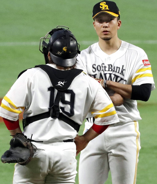 ロッテ戦の三回に得点を許した後、右肘を気にするしぐさを見せた千賀(C)共同通信社