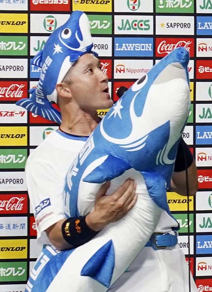 巨人に勝利し、お立ち台でパフォーマンスをする杉谷(29日)/(C)共同通信社