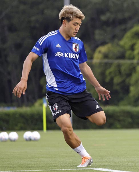 30日の代表合宿で汗を流す堂安(C)共同通信社