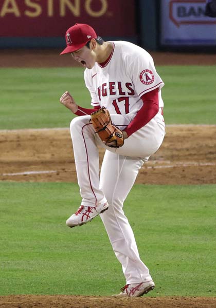 レッドソックス戦の七回、先頭打者を三振に仕留めてガッツポーズする大谷(C)共同通信社