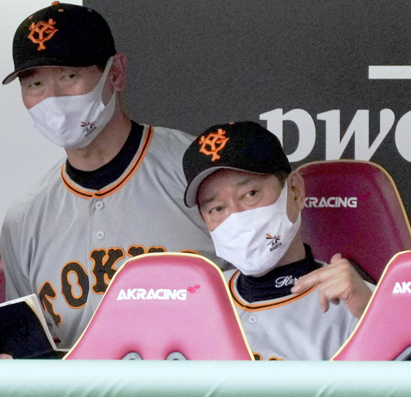 投手陣の炎上にベンチで渋い表情の原監督と桑田投手チーフコーチ(左)/(C)共同通信社
