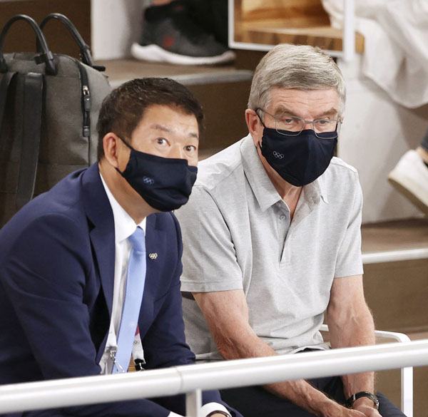 2021年の東京五輪で体操会場に訪れたIOCのバッハ会長(右)と話す国際体操連盟の渡辺守成会長(C)共同通信社