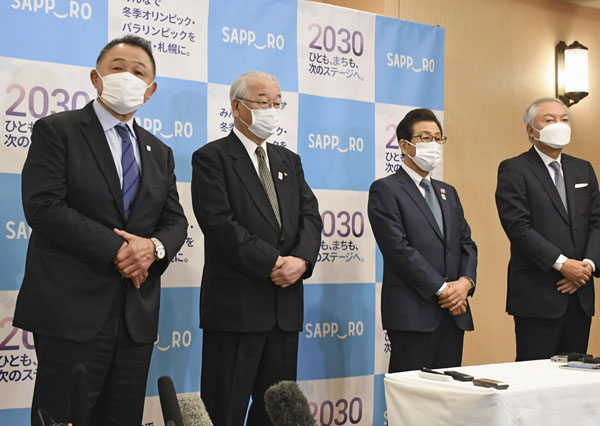 プロモ委員会の初会合を終え、取材に応じる山下JOC会長(左)、秋元札幌市長(右2)/(C)共同通信社