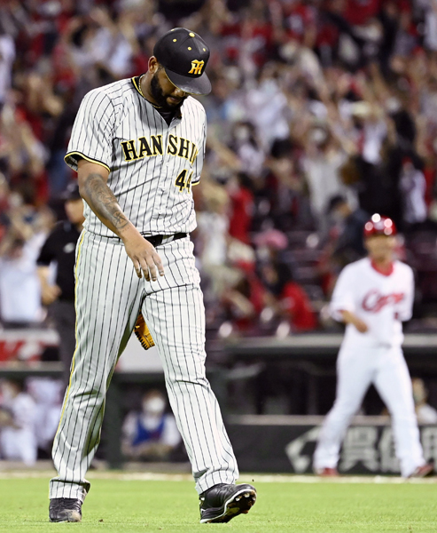 宇草にサヨナラ本塁打を浴び、ベンチに引き揚げる阪神・アルカンタラ(C)共同通信社