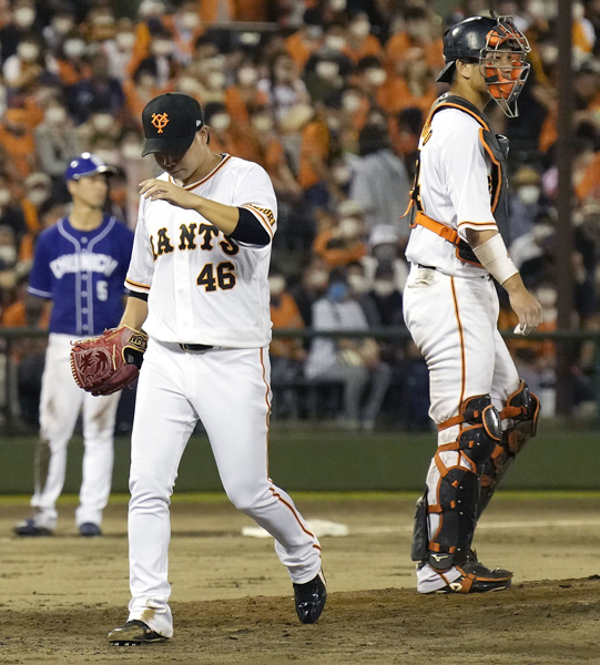 29日の中日戦、十回に押し出し死球を与え、降板する鍬原(C)共同通信社