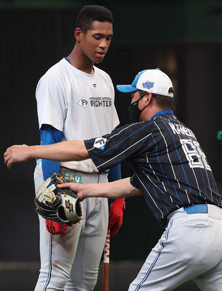 29日の試合前に金子コーチの指導を受ける万波(C)日刊ゲンダイ