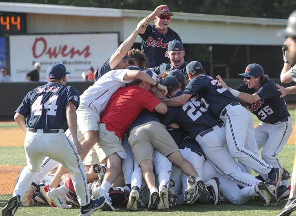 NCAA大学野球で、南ミシシッピー大学に勝ち、積み重って喜ぶミシシッピー大学の野球部メンバー(C)Bobby Mcduffie/CSM via ZUMA Press Wire/共同通信イメージズ