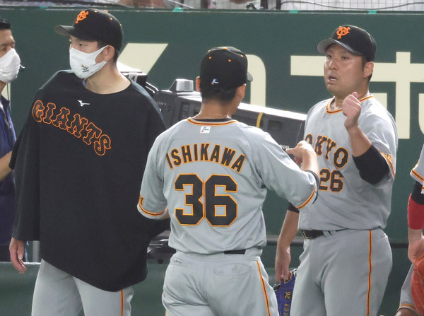 七回に2番手として好投した左腕の今村(右)と8勝目の戸郷(左)/(C)日刊ゲンダイ
