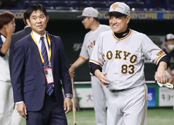 東京ドームを訪れ、試合前の練習を見学するサッカー日本代表の森保監督。右は巨人・原監督(C)共同通信社
