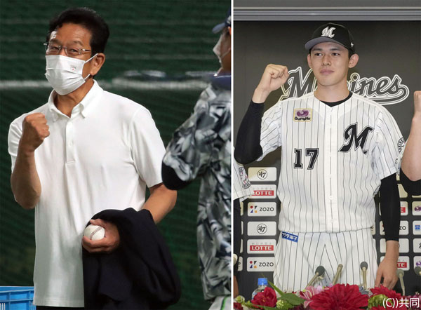 視察にいそしむ栗山日本代表監督(左)、プロ野球オールスター戦ファン投票で初選出され、ガッツポーズのロッテ・佐々木投手(C)日刊ゲンダイ