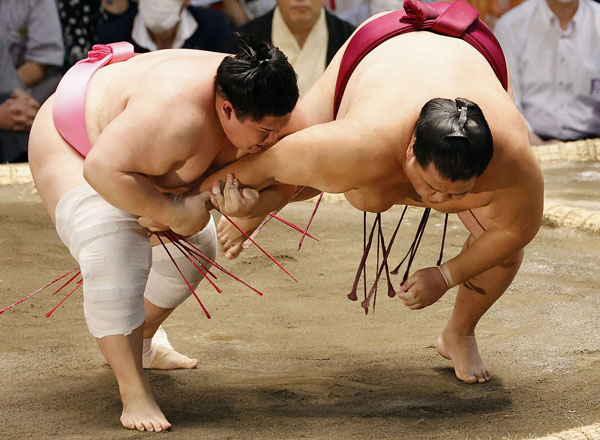宇良(左)にとったりで敗れた御嶽海(C)共同通信社