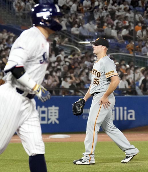 デビュー戦でヤクルト・村上(左)に3ランを浴びた巨人・クロール(C)共同通信社