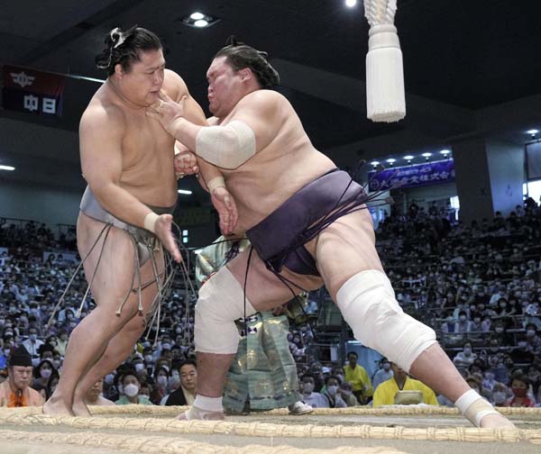 若隆景(左)を押し出した照ノ富士(C)共同通信社