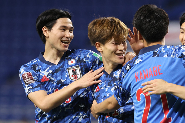 日本代表をW杯へ導いた古橋(中央)と南野(左端)/(C)JMPA