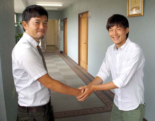 中大から岐阜入りする際の古橋(右)と興国高の内野監督(内野監督提供)